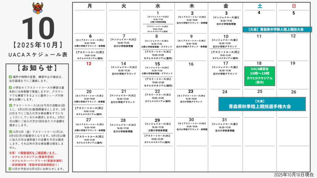 Blog イベント情報 2025.09.22 2025年10月各コース開催スケジュールや出場大会予定のお知らせ ※以下、内容は2025年10月16日18時00分現在の情報となります。 ※小学生コースで活用する体育館が学校行事のため使用に関して制限がございます。 10月修正版②ダウンロード 🔽2025年11月の予定表もお知らせします。 2025年11月各コース開催スケジュールや出場大会予定のお知らせ 関連 関連記事: 2021年7月各コース開催スケジュールや出場大会予定のお知らせ 2021年8月各コース開催スケジュールや出場大会予定のお知らせ 2022年UACAの活動を振り返る 2024年7月・8月各コース開催スケジュールや出場大会予定のお知らせ ブログ一覧