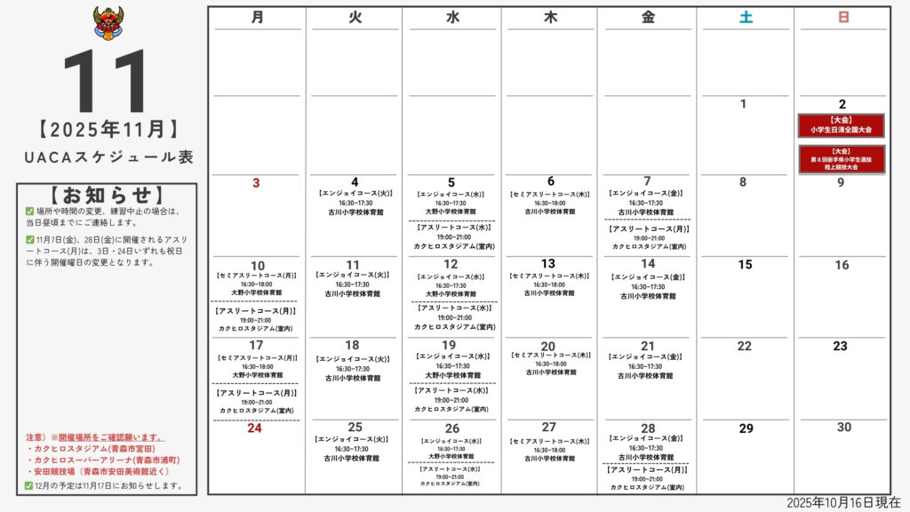 Blog イベント情報 2025.10.17 2025年11月各コース開催スケジュールや出場大会予定のお知らせ ※以下、内容は2025年10月16日18時00分現在の情報となります。 11月 (1)ダウンロード 関連 関連記事: 2021年7月各コース開催スケジュールや出場大会予定のお知らせ 2021年8月各コース開催スケジュールや出場大会予定のお知らせ 2022年UACAの活動を振り返る 2024年7月・8月各コース開催スケジュールや出場大会予定のお知らせ ブログ一覧