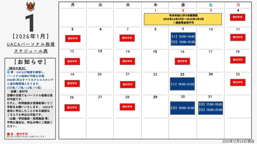 ※「○・△」の場合でも、指導内容・競技種目・年齢等を踏まえ、UACA側の判断でお断りする場合がございます。あらかじめご了承ください。