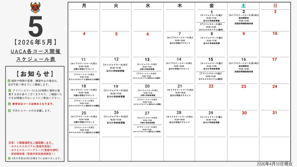 今月よりスケジュール表には開催コースのみ記載します。大会にあっては対象者へ連絡いたします。